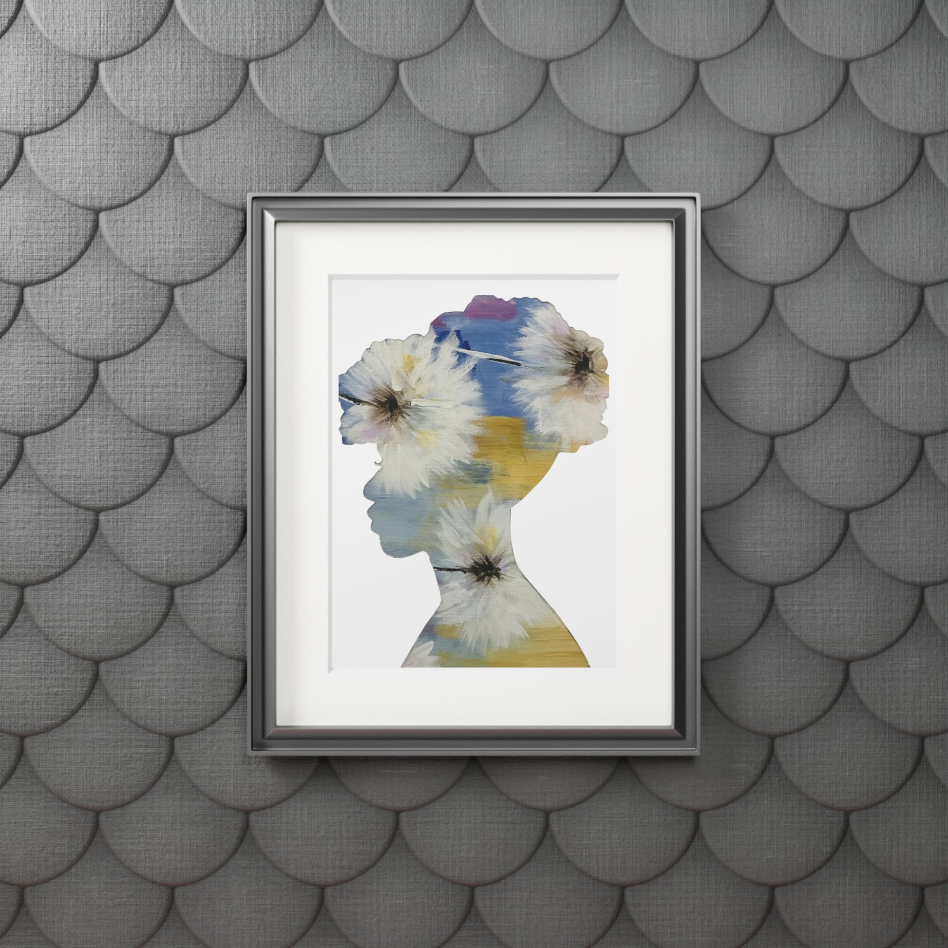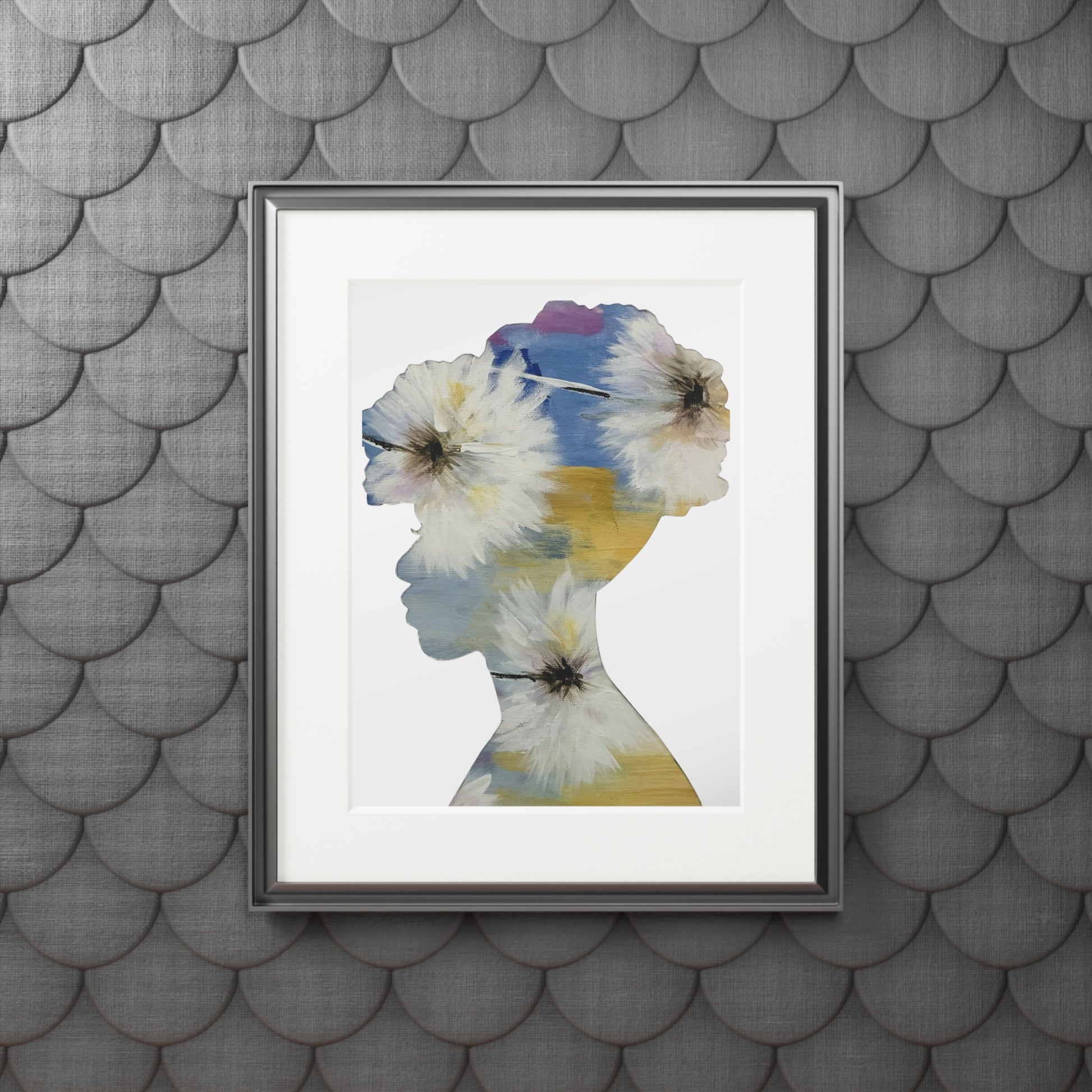 Recycled painting, Floral silhouette art, Black woman art print, Sustainable artwork, Afrocentric decor, Woman portrait print, Empowering home decor, Feminine wall art, Black girl magic, Inspirational decor, Modern boho print, Unique gift idea, Abstract floral art, Elegant wall decor, Gift for her, African American artist, Woman silhouette, Eco-friendly art, Mixed media print, Storytelling art, Wall art decor, Painterly print, Upcycled art, Cultural pride art, Creative renewal