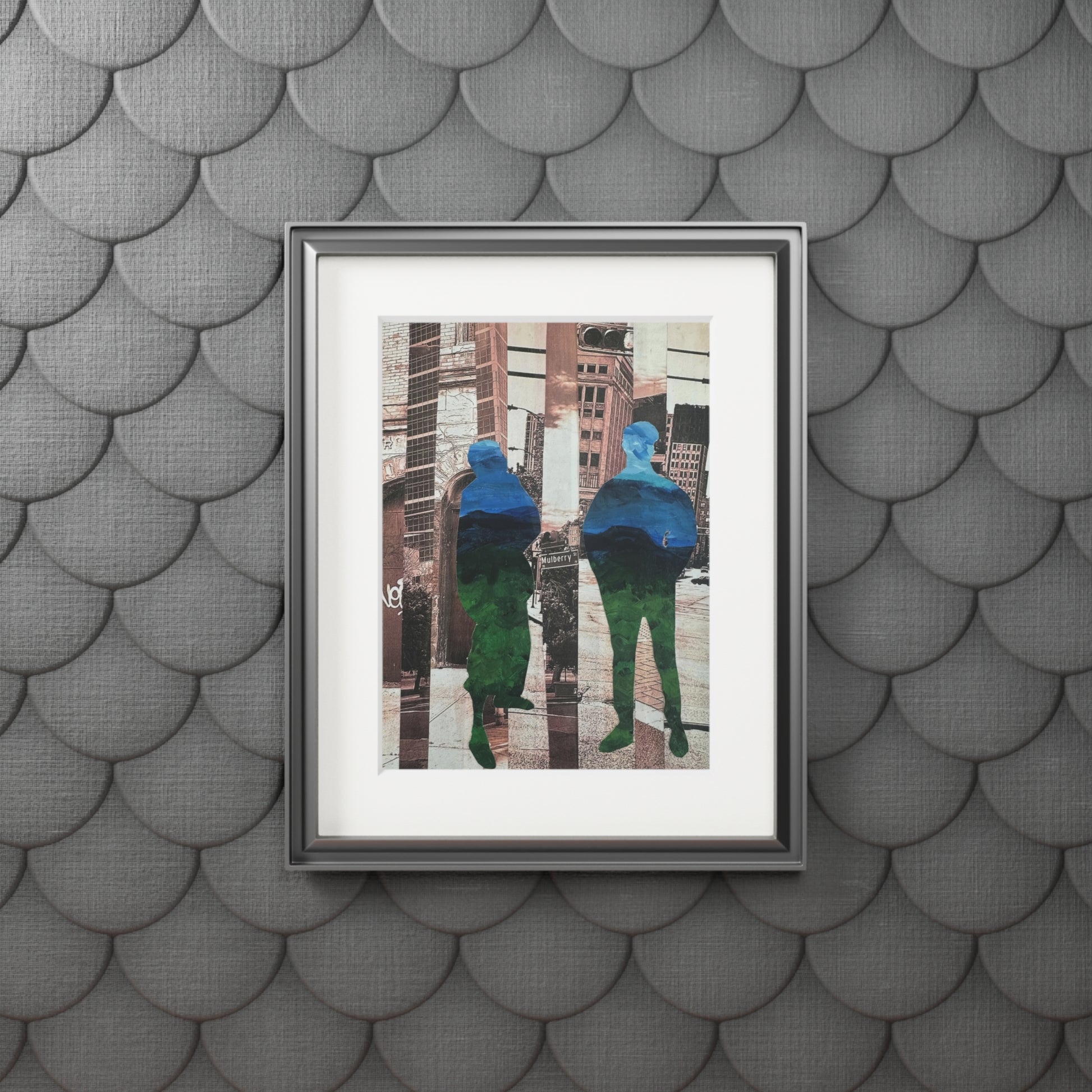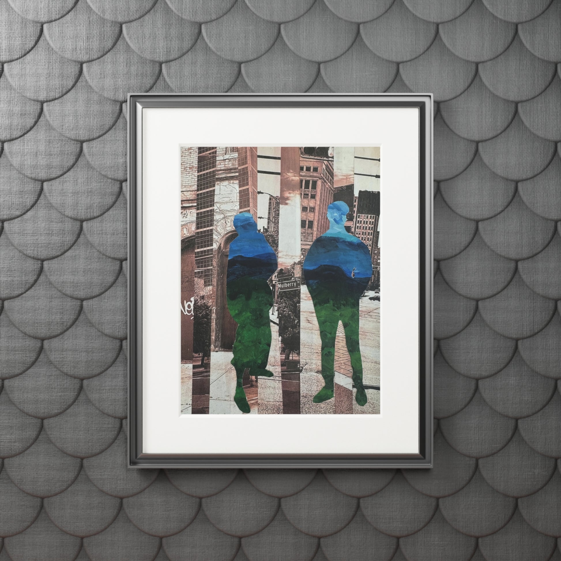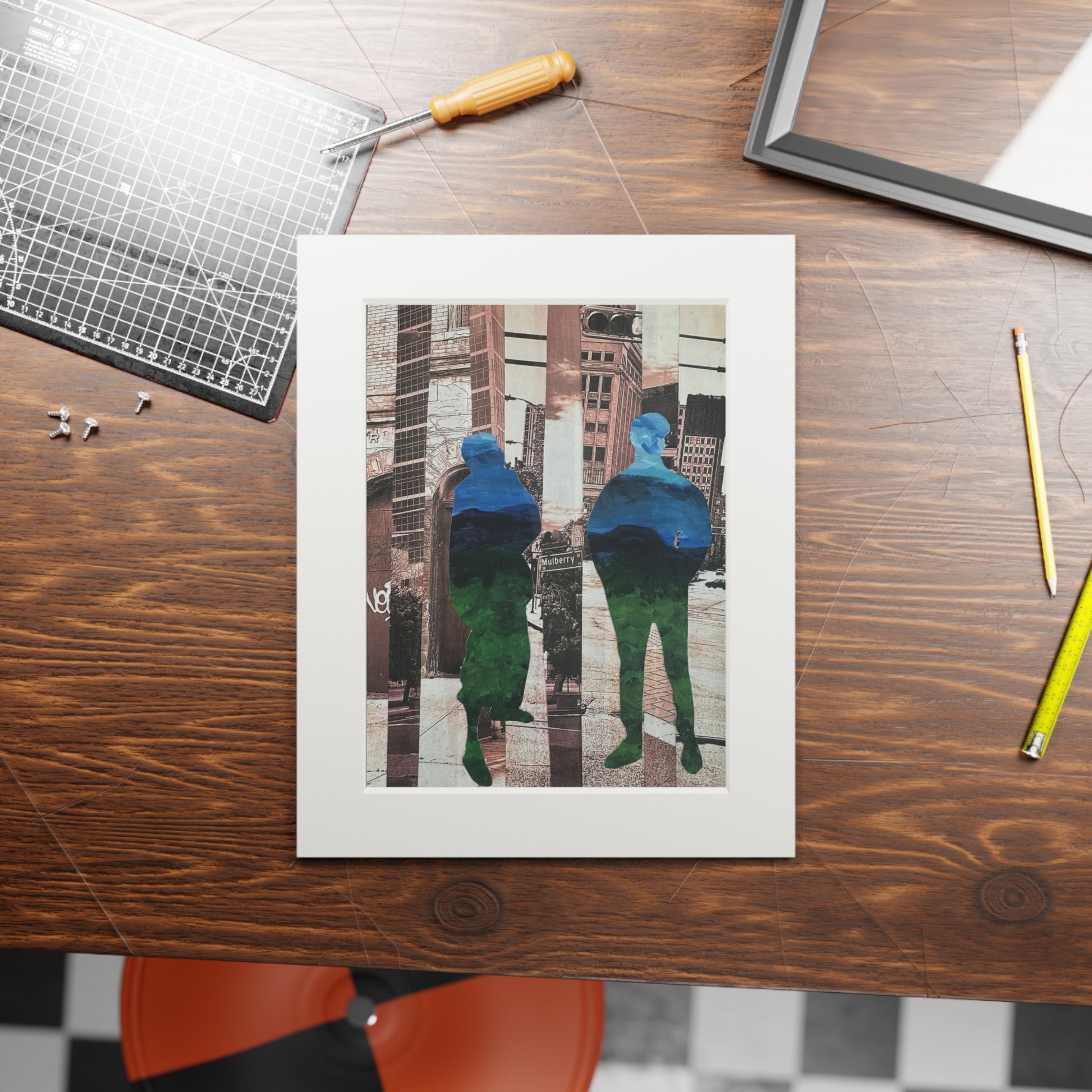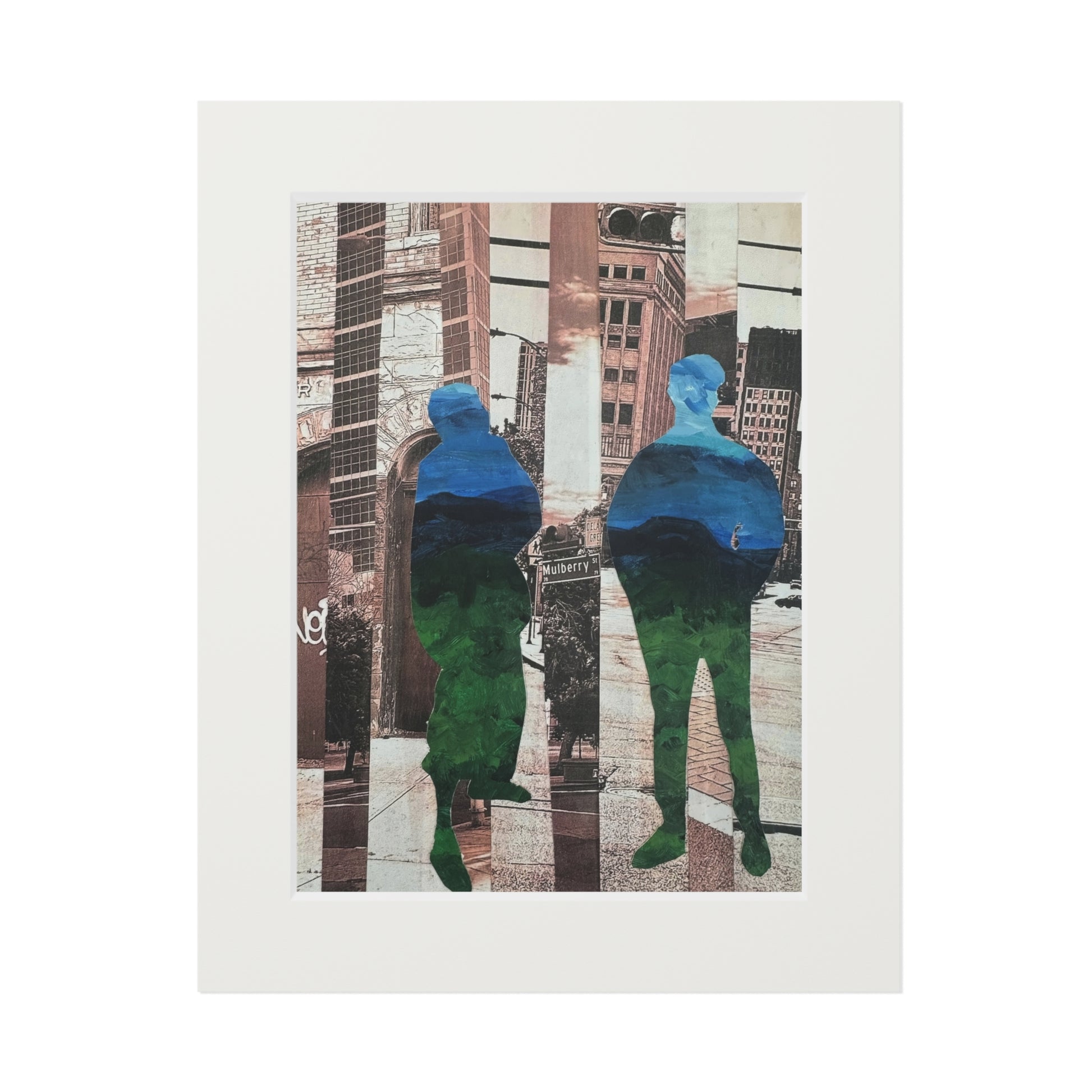 "Not a Threat – Rooted in Place" is a striking mixed media collage series by artist Simone Anthony-Brown, exploring presence, memory, and place through layered visual storytelling. Each piece features silhouetted Black male figures—rendered from abstracted, recycled paintings—rooted within fragmented urban landscapes of Newark, NJ. These cityscapes, reconstructed from original photographs, echo with architectural grit and emotional resonance. Layered textures and vibrant color contrasts transform the figures into symbols of visibility, protection, and dignity in public space.