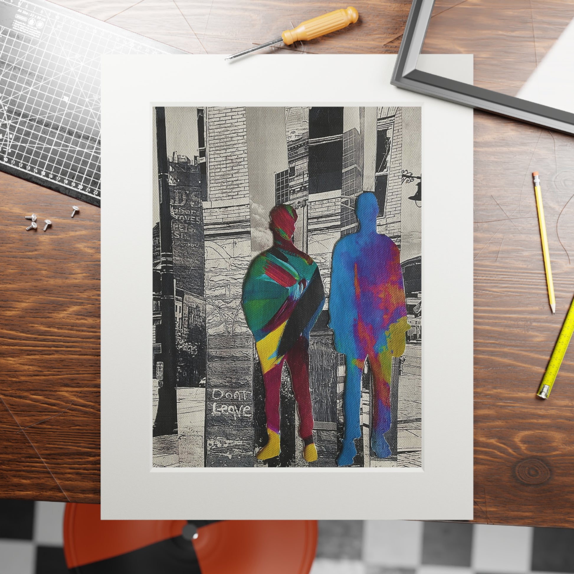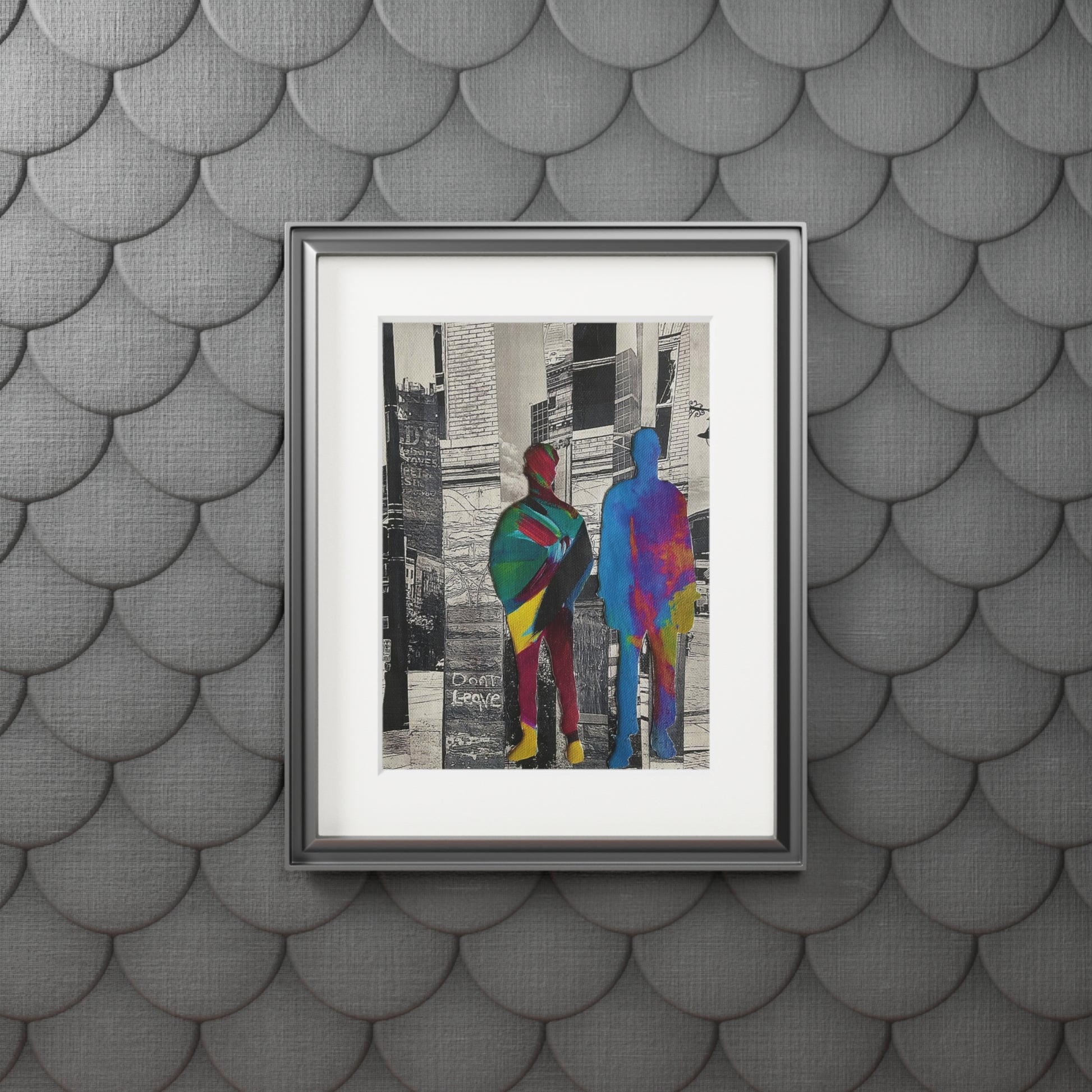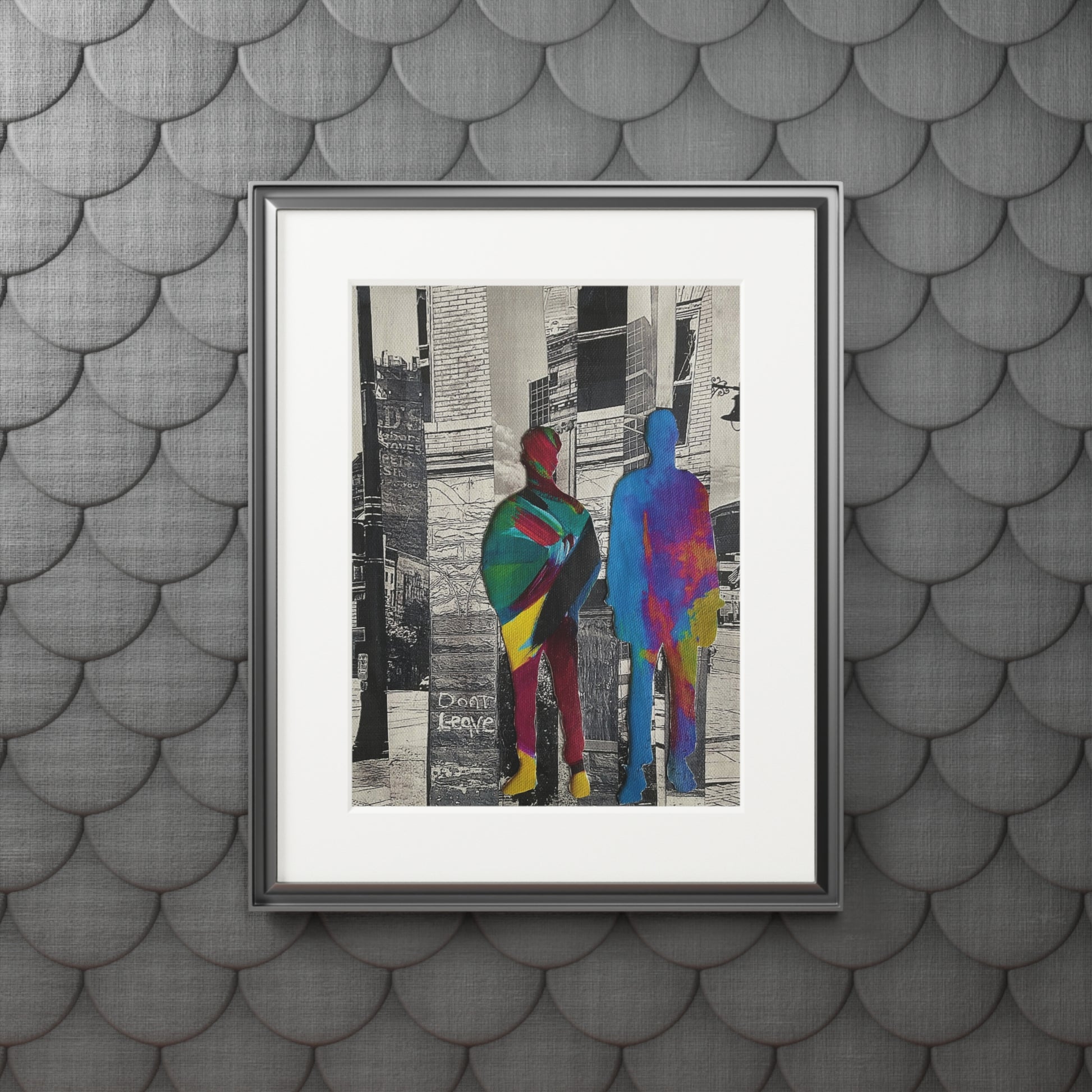 Words like "Don’t Leave" and "Stay Here, Put It Right Here” appear subtly in the background, suggesting both urgent pleas and grounding affirmations. Through bold silhouettes and reflective textures, this series challenges the viewer to consider who is seen, who belongs, and what it means to stand one’s ground.